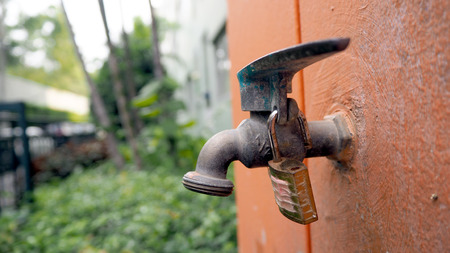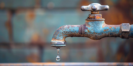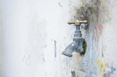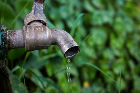 Old rusted vintage water tap with a small drop of water dripping from it, symbolising the Global problem of lack of water.