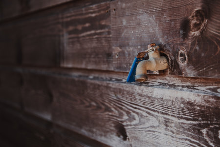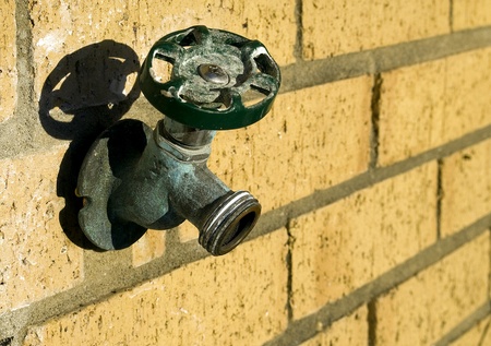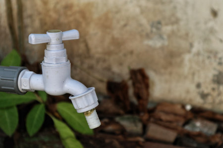 Outdoor water tap in nature background. Photo of an outdoor faucet in the garden.