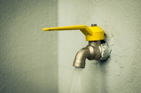 Dripping Water tap. Water leaking from tap or faucet. Day time image of metal tap with running water.