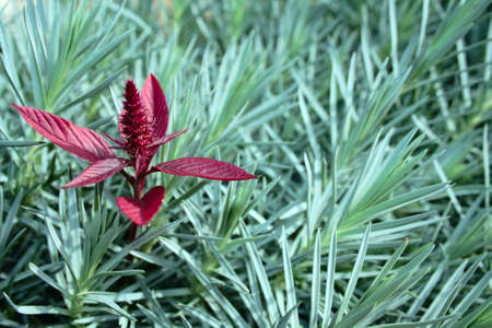 Indian red amaranth plant growing in summer garden. Leaf vegetable, cereal and ornamental plant, source of proteins and amino acids.