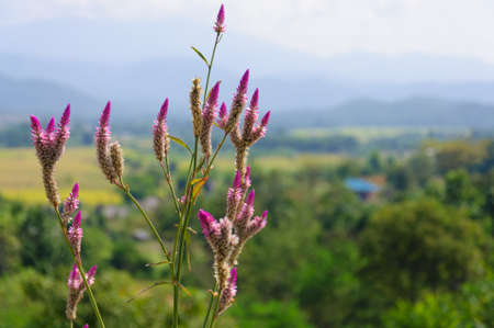 Pink and white Plumed Cockscomb flower with green blurred background of mountain.