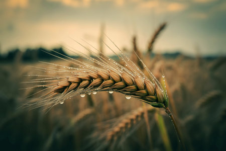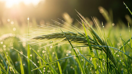 A close-up macro view captures the delicate beauty of wheat stalks glistening with dew drops at sunrise. The golden light of dawn illuminates the field, creating a warm and serene atmosphere. Sun rays filter through the stalks, casting long shadows and creating a soft bokeh effect in the background. The highlights the intricate details of the wheat heads and the tiny water droplets, evoking a sense of natural tranquility and the promise of harvest.