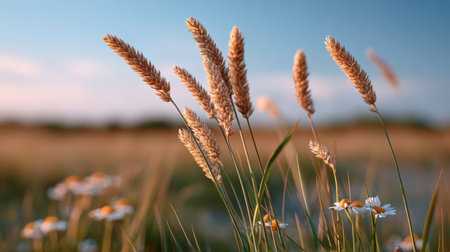A peaceful scene featuring golden wheat and delicate white daisies swaying gently in the breeze at sunset. The soft lighting enhances the beauty of nature.