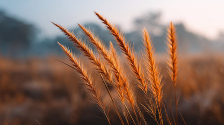 A stunning close-up image of golden grass standing tall in the morning sun, creating a peaceful atmosphere in a serene natural landscape, perfect for nature lovers.