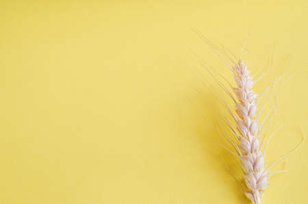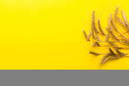 Sheaf of wheat ears close up and seeds on colored background. Natural cereal plant, harvest time concept. Top view, flat lay with copy space. world wheat crisis.