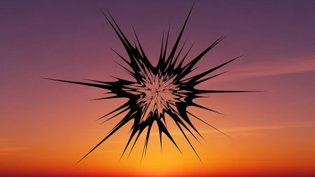 A sharp black abstract starburst shape is set against a vibrant gradient sky at sunset.