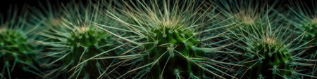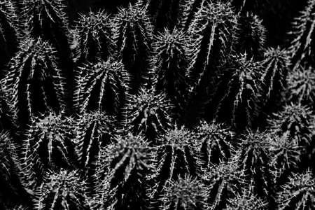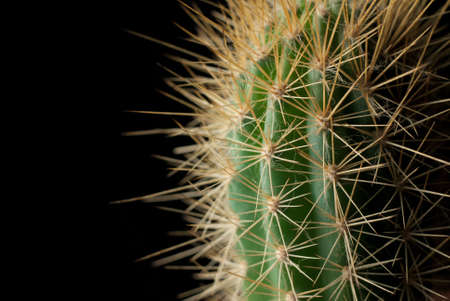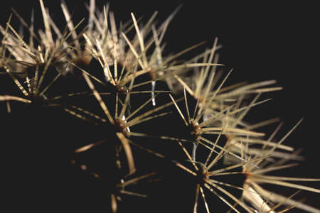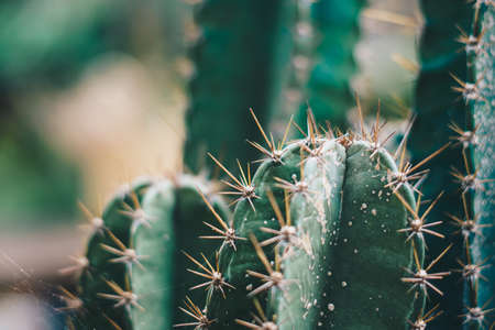 Green dusty cactus with big black spikes close-up macro background. Selective focus and image with shallow depth of field