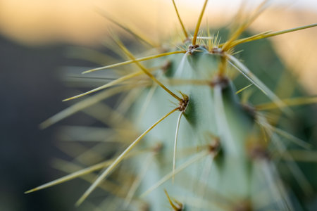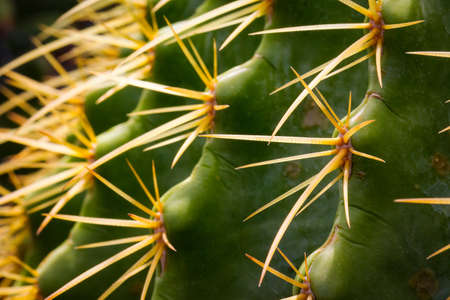 Real nature beauty background. Close-up Dark green oblong cactus prickly yellow needles. Floral concept, decoration, plant breed class, loneliness conflict difficult character situation, sharp joke