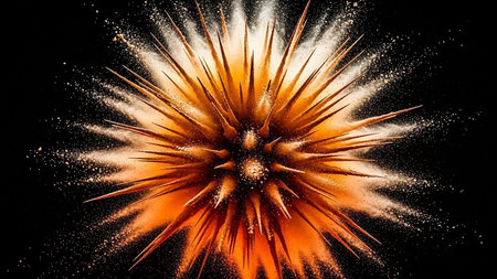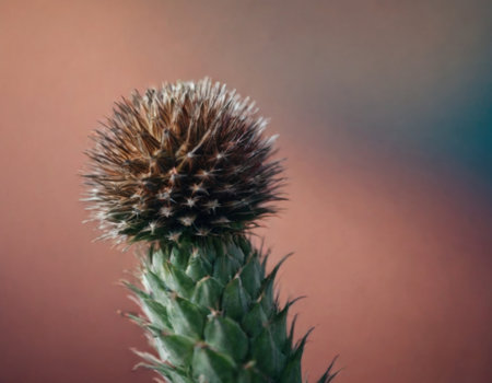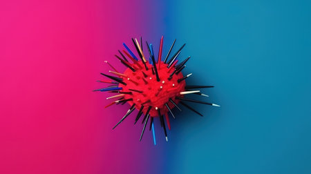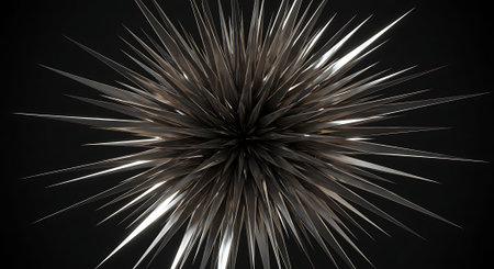 An artistic representation shows a metallic sphere covered in sharp, pointed protrusions. The object, rendered with a gradient effect, is set against a plain, neutral background, emphasizing its texture and form. This image is suitable for a variety of uses, including graphic design, educational materials, and conceptual art projects.