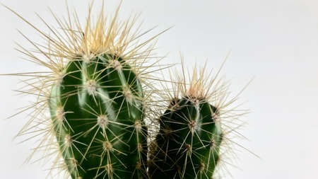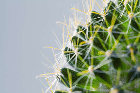 A part of cactus with long thorns on the light background. Macro, selective focus