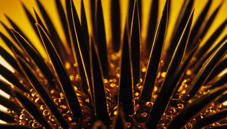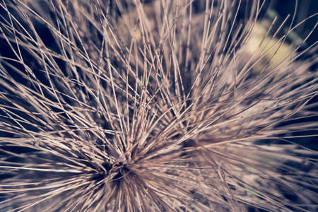 Abstract real photo nature beauty background. Macro dry tropical long needles thorns branch plant grass looks like firework. Decor element ideas. Blue brown sun tone. More color in stock