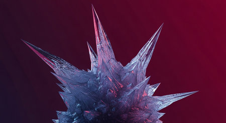This striking image features an abstract, spiky crystalline structure with mesmerizing blue and purple highlights against a deep red backdrop.