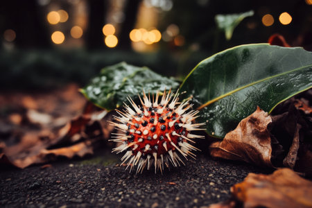 Spiky chestnut on forest floor with autumn leaves and green foliage.