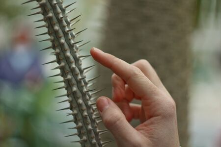 Men's hands touch the cactus needles. Checking humidity in the botanical garden. Blur, clean, bright, modern, colorful, contrast, selective focus. Pain concept