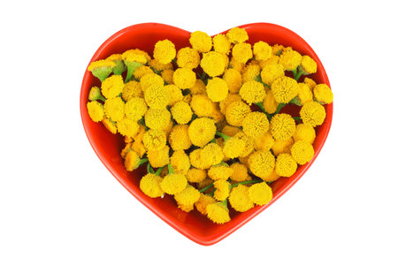 Tansy flower or Tanacetum vulgare in ceramic bowl isolated on white background. Top view. Flat lay.