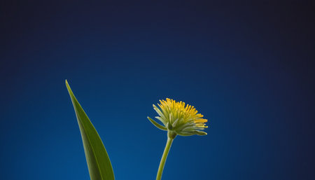 A close-up studio shot a delicate yellow flower bud with prominent stamens, positioned on the right side of the frame. A single, elongated green leaf extends from the left, its pointed tip reaching upwards. The background is a smooth, deep blue gradient, creating a stark contrast that highlights the vibrant colors and intricate details of the plant. The lighting emphasizes the textures and forms of the flower and leaf.