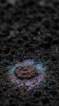 Extreme macro photograph focused on a limited, central patch of shimmering iridescent metallic powde