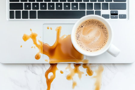 Disaster moment as coffee spills on laptop, representing accidents, tech issues, and work-from-home hazards.