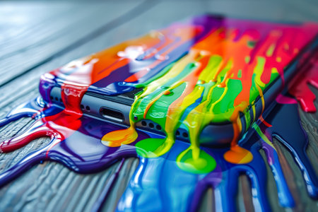 Phone is covered in rainbow paint, with the colors splattered all over it. The phone is upside down, and the paint is dripping down the sides. Concept of fun and creativity