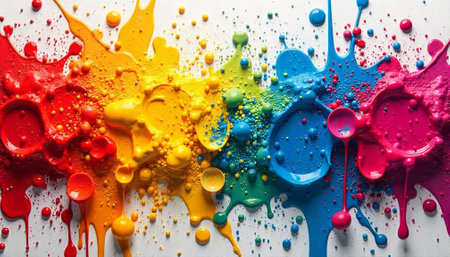 Bright colors collide in an exciting array of paint splashes, showing creativity and artistic expression.