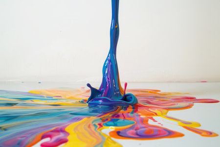 Close-up view of vibrant paint drops flowing and mixing together, creating a stunning display of color and reflection. Perfect for artistic projects.