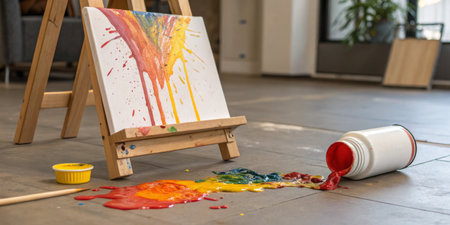 Bright colors splash across the floor of a modern studio, with paint spilling from a overturned container beside a canvas. Art supplies are scattered nearby, enhancing the creative chaos.