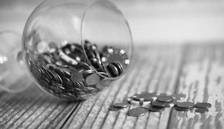 A vintage glass jar tipped over, spilling a variety of coins onto a rustic wooden surface. The scene captures the charm of forgotten treasures and wealth.