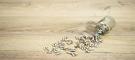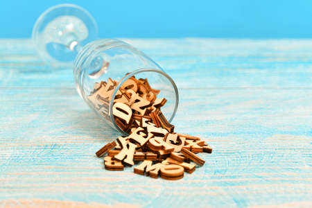 brown wooden letters are scattered on a wooden table from a champagne glass.