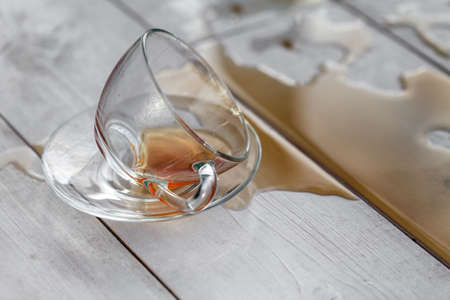 A glass jar broken on a wooden floor, with spilled marbles or beads rolling away from the fragments.