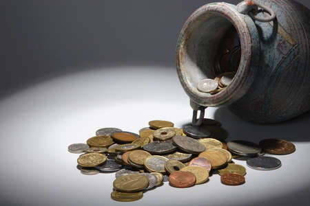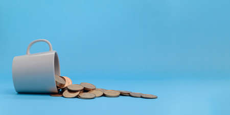 Yellow ceramic cup fell and metal coins scattered, isolated on white background. Image of metallic money. Store and protect savings. Copy space. Selective focus.