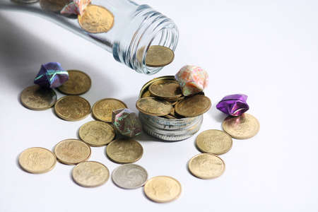 Metallic money poured out of a cup isolated on a white background. Russian pennies. Copy space for text. Selective focus.