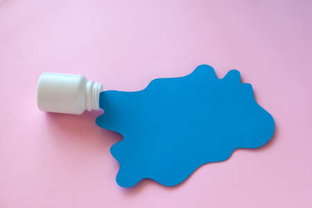 White pill packaging with blue paper splash on pink background. Medicine concept.