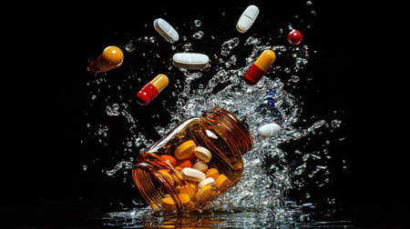 A high-speed image of a pill bottle crashing through the waters surface, sending pills and bubbles flying.