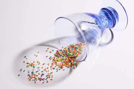 A clear glass bottle overturned on a desk, releasing an array of colorful paper stars in random patterns.