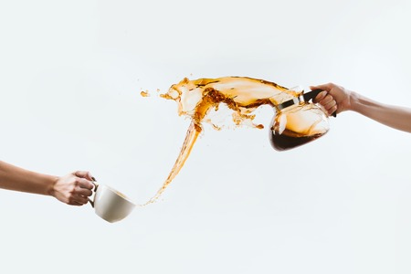 cropped view of hands splashing aromatic coffee from cup and glass pot, isolated on white