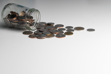 High-key finance scene with a clear jar positioned behind rows of shiny coins.