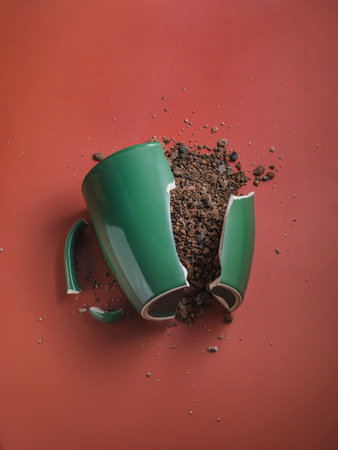 Green broken cup on a bright brown background. The cup served as a flower pot. Scattered earth around. Conceptual photography