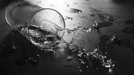 A striking black and white image of a glass cup spilling water on a dark surface, emphasizing the fluidity and movement of water in a visually compelling way.