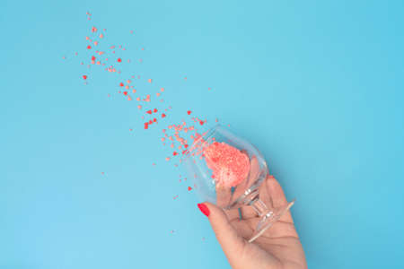 Pink and red hearts with small beads spilled out of the glass in female hand on blue background. Greeting card. Love, Valentines Day or other holiday concept. Flat lay style with copy space