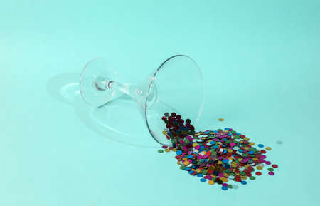 Cocktail glass with confetti on a mint blue background. Minimal party concept