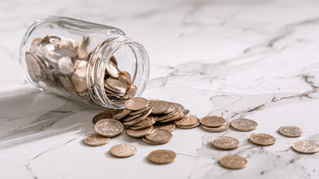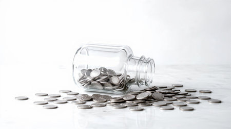 Modern savings presentation featuring a transparent jar angled slightly with coins pooled around it, commercial-safe.