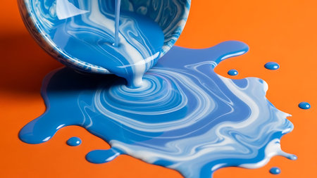 Blue paint pouring from a can onto an orange surface, forming a dynamic abstract pattern.