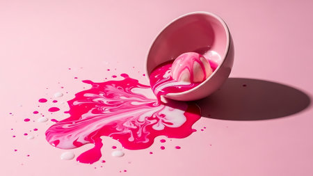 A tipped-over pink cup releases a swirling mix of pink and white liquid onto a pink background.