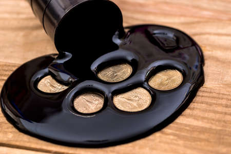 Concept of oil business on wooden desk - oil and coin