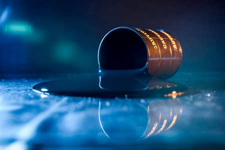 Opened toy barrel of oil on dark background
