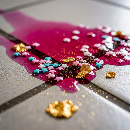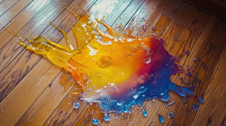 A colorful juice spill surrounding broken glass on a kitchen floor, creating a messy, vibrant scene.