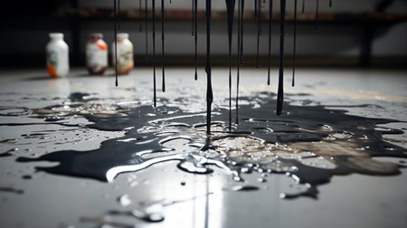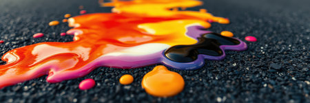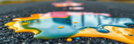Colorful paint spill spreading across asphalt surface in urban setting during sunlight