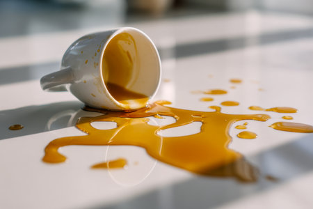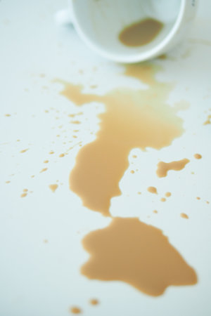 Coffee spill on a white table after cup falls over