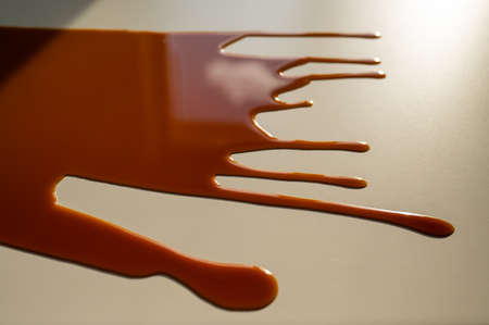 closeup of a chocolate syrup drop on a concrete surface, shallow depth of field