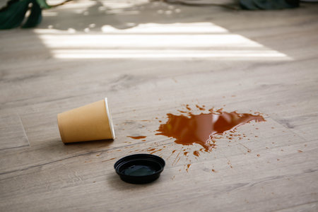 Paper cup of coffee fell on laminate, coffee spilled on floor.